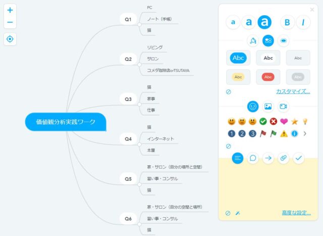 価値観ワークは単純に箇条書きでも良いのですが、マインドマップを使うとブレインダンプ効果もあり、頭の中がスッキリ整理されるのでおすすめです。
