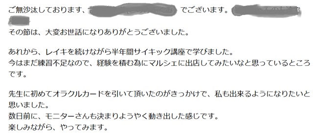 その節は、大変お世話になりありがとうございました。あれから、レイキを続けながら半年間サイキック講座で学びました。